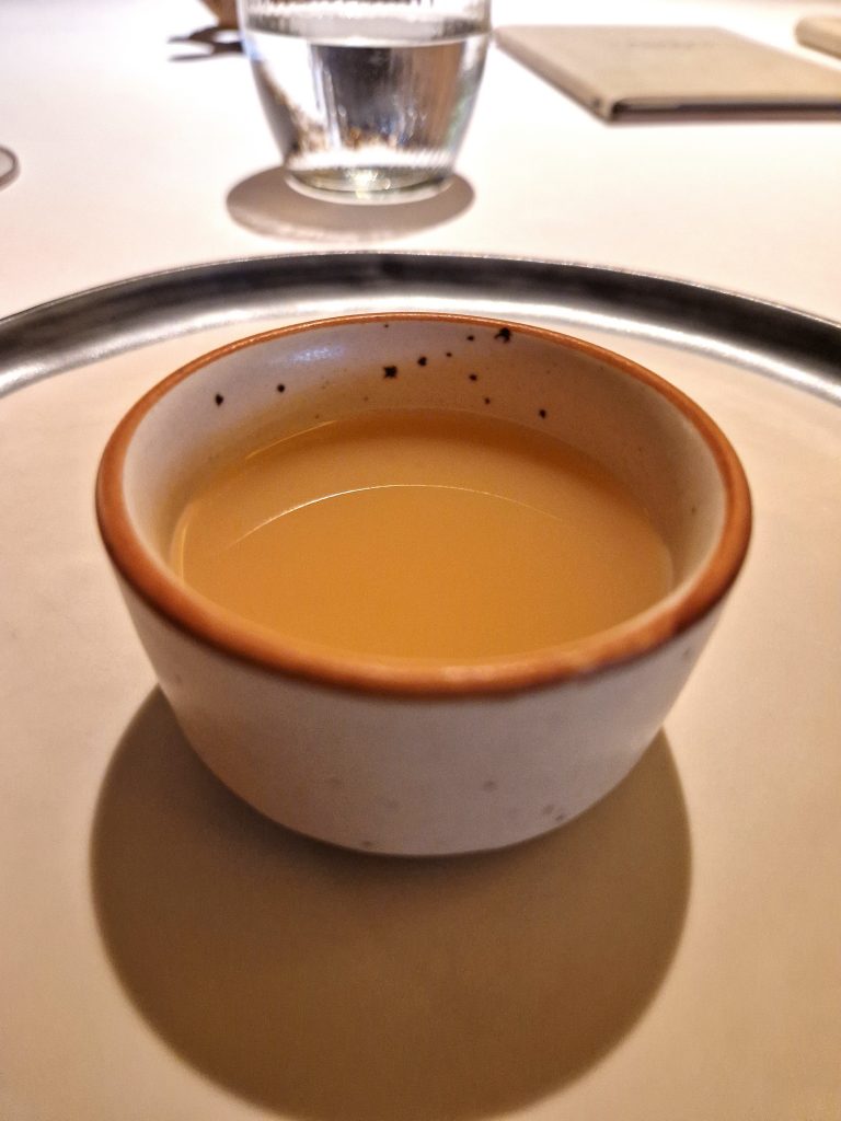 • Caldo de cocido: un inicio cálido y reconfortante. Sabor profundo, limpio, con notas de hueso, verdura y legumbre. Es puro Madrid en taza.